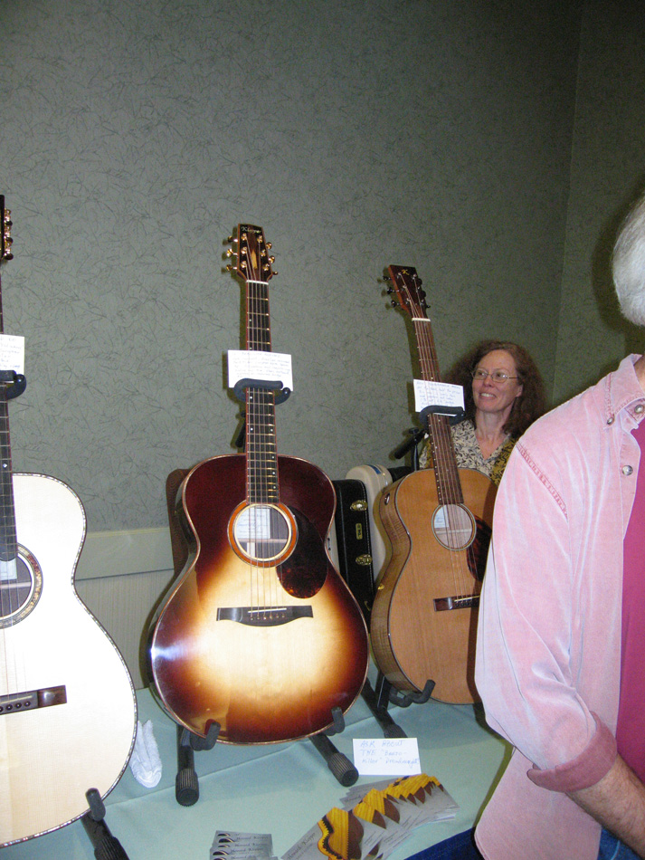 I've been wanting to meet Mike ever since I played one of his dreadnoughts several years ago at Buffalo Brothers. My favorite of his guitars was the one on the right, though the Sinker Redwood (left) was quite nice as well.